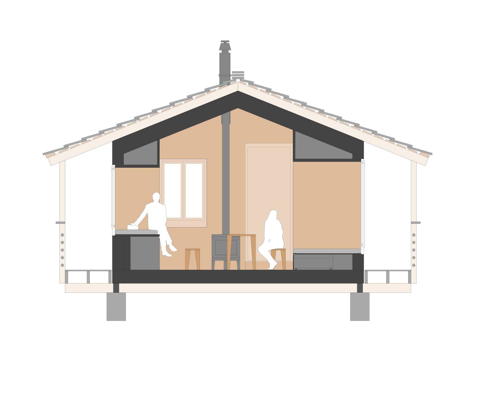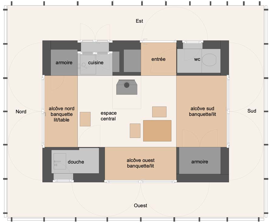 L’espace de vie central, entouré par trois grandes alcôves entièrement vitrées, est baigné de lumière et ouvert sur le paysage. Chaque alcôve permet le jour de profiter de la vue, se détendre et la nuit se transforme en lit. Le poêle à bois vitré au centre permet de chauffer le lieu et de profiter de sa lumière reposante. Il est également équipé pour poser des casseroles et cuire, comme dans un four, des plats en cuisson lente.